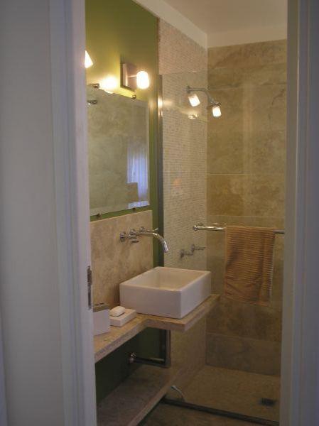 glass enclosed shower and travertine counter.